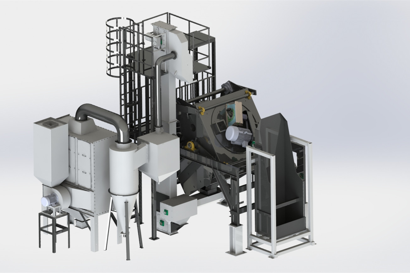 The structure of the tumble shot blasting machine: the tumble shot blasting machine is mainly composed of a drum, a separator, a blasting machine, a hoist, a gear motor and the like.